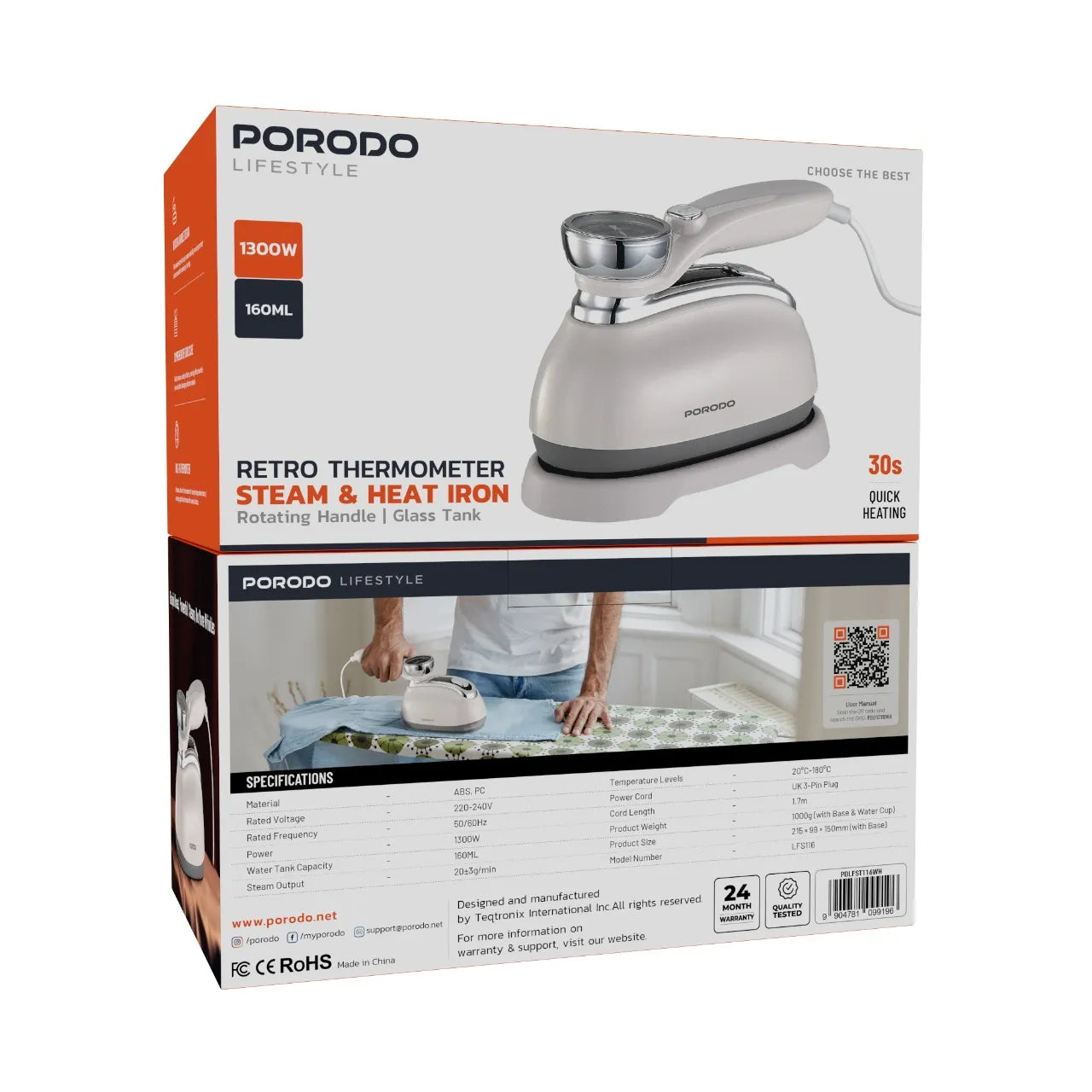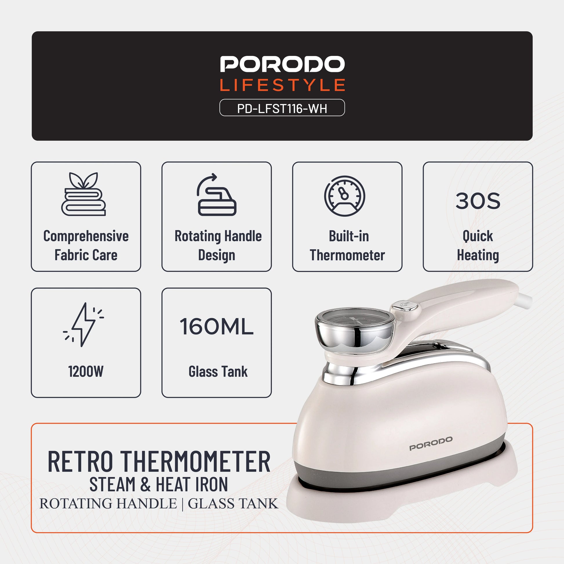 The Porodo Lifestyle Retro Thermometer Steam & Heat Iron injects vintage style to a new level of functionality and is a fashion-forward yet powerful addition to your laundry. Constructed from durable ABS and PC materials, the iron is designed to endure regular use. A rated voltage of 220-240V powers it at 50/60Hz frequency and has a robust 1200W performance for a quick and efficient ironing process. It features a 160mL water tank and a steam output of 20±3g/min, conveniently ironing out creases from various garments. Adjustable temperature settings from 20°C to 180°C ensure complete care for the fabric. Its thermometer and 30-second fast heating system guarantee precise temperature regulation, while the rotating handle design and 1.7m UK 3-pin plug cable ensure convenience and portability. Perfect for day and evening wear, the Porodo Lifestyle Retro Iron ensures a professional finish every time.